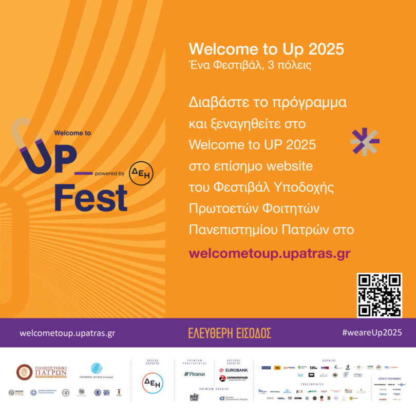 To Welcome to UP 2025 powered by ΔΕΗ διοργανώνεται από το Πανεπιστήμιο Πατρών, σε συνδιοργάνωση με την Περιφέρεια Δυτικής Ελλάδας και το Επιμελητήριο Αχαΐας, σε συνεργασία με τους Δήμους Πατρέων, Αγρινίου και Μεσολογγίου και με τη στήριξη του Υπουργείου Πολιτισμού.